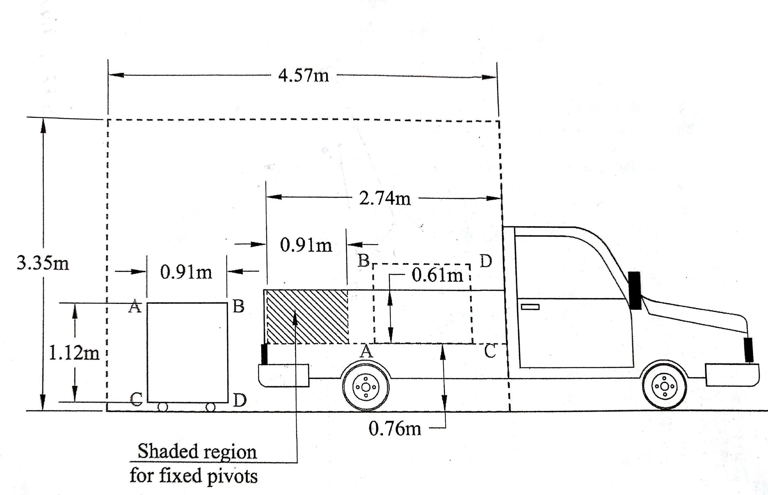 For the design of the mechanism, the box must not exceed the workspace beyond the dotted lines of the large bounding box and fall within the dotted lines denoted by ABCD on the bed of the truck. The shaded region on the bed of the truck must also contain the fixed pivot. With the depth of the usable area shown in Figure 2.